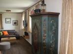 Alle Wohnungen mit Kaminofen, gemütlicher Ledercouch und Sessel
